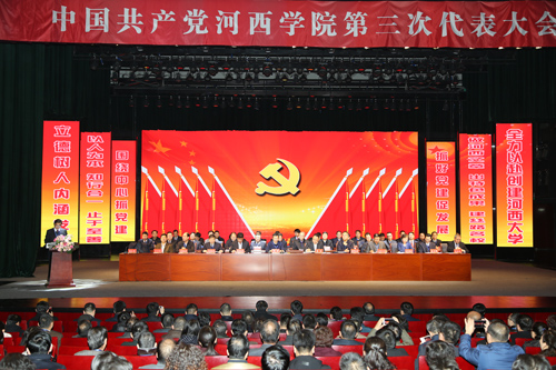 大会的主题是:高举中国特色社会主义伟大旗帜,以邓小平理论、“三个代表”重要思想、科学发展观为指导,深入学习贯彻习近平总书记系列重要讲话精神,按照“五位一体”总体布局和“四个全面”战略布局,全面贯彻“五大发展理念”,团结和动员全校共产党员和师生员工,坚持立德树人为根本,内涵发展为核心,凝心聚力打造学校发展升级版,全力以赴创建河西大学。