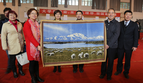 校长刘仁义、纪委书记徐德祯与吐鲁番地区教育局书记陈锦一行亲临招聘会现场指导并与学生沟通交流,鼓励学生去吐鲁番就业,服务新疆。吐鲁番地区教育局书记陈锦在现场赠送我校挂毯一副,天山牧场一衣带水,展望着我校与吐鲁番地区合作的美好明天。