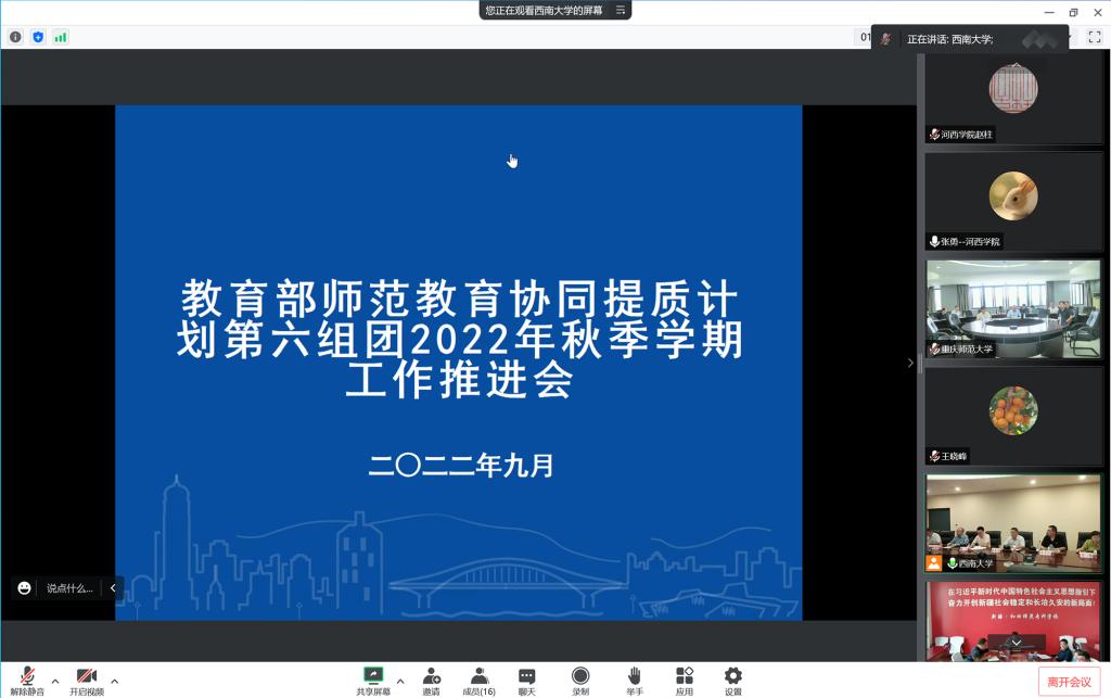 9月20日,教育部师范教育协同提质计划第六组团牵头高校—西南大学主持召开师范教育协同提质计划第六组团2022年秋季学期工作推进会议。此次会议采取线上线下相结合的方式进行。会议由西南大学金沙党委书记郭亮主持。西南大学、山东师范大学、新疆师范大学、重庆师范大学、和田师范专科学校、长江师范学院分管校领导及工作联络员参加会议。我校在教师教学发展中心设立分会场,党委常委、副校长张勇,党委常委、教务处处长赵柱及相关人员参加了会议。