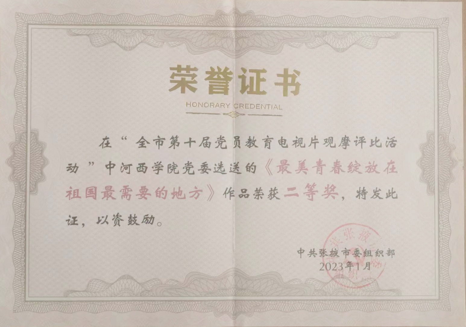 近期,中共张掖市委组织部公布了全市第十届党员教育电视片观摩评比活动作品评选结果,我校选送的作品《最美青春绽放在祖国最需要的地方》荣获二等奖。该作品讲述了我校2009届毕业生、全国“最美基层高校毕业生”候选人董宏亮支教援疆的先进事迹,是开展党员教育培训的鲜活教材。学校党委要求各二级党组织充分发挥获奖作品的教育激励作用,组织党员学习收看,从中汲取精神养分、发挥榜样力量、激励担当作为。要引导广大师生党员通过张掖党建网、张掖组工微信公众号等主动获取教学资源开展自主选学,有力有效扩大覆盖面和资源使用率,推动新时代师生党员教育走心走实。