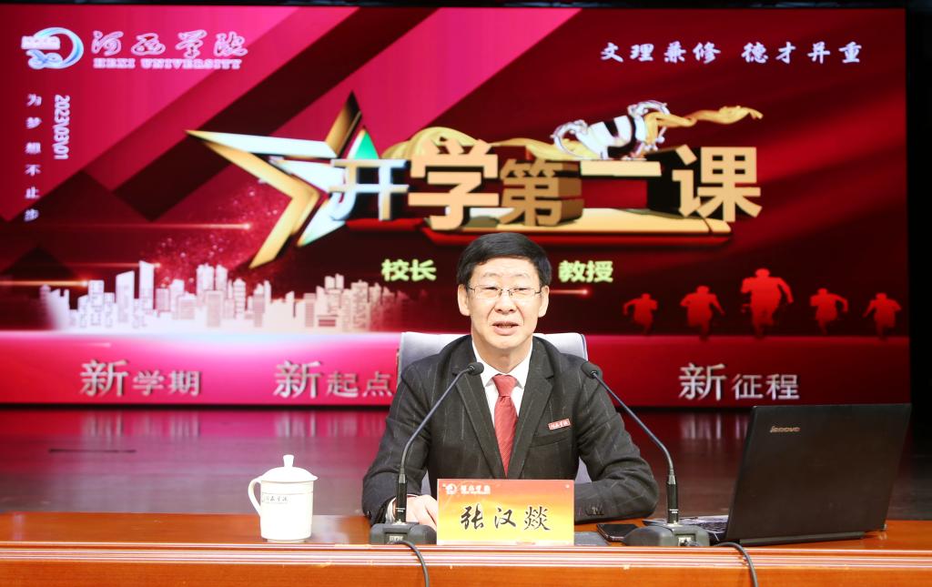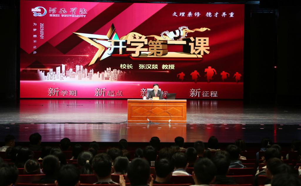 3月1日下午,校长张汉燚在河西讲堂报告厅为全校同学讲授“开学第一课”,800多名师生代表现场参加,12000多名学生通过现场直播聆听。