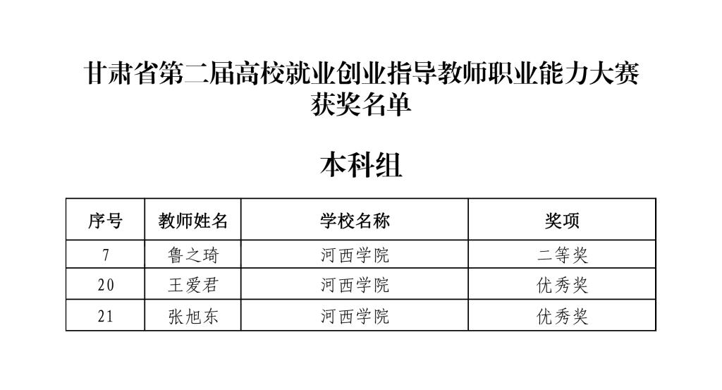 据统计,甘肃省第三届高等院校就业创业课程案例设计大赛中王爱君获一等奖,鲁之琦、王欢、石砚等5个团队获二等奖;甘肃省第二届高校就业创业指导教师职业能力大赛中鲁之琦获二等奖,王爱君、张旭东获优秀奖;甘肃省第三届高校毕业生就业创业故事征文大赛中贾雯娜等4名同学获一等奖,陈彦东等3名同学获二等奖,李斐斐等5名同学获三等奖。