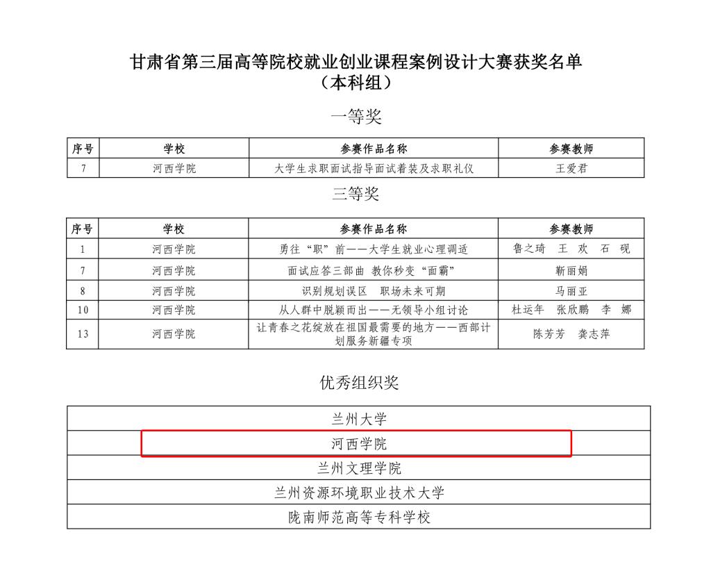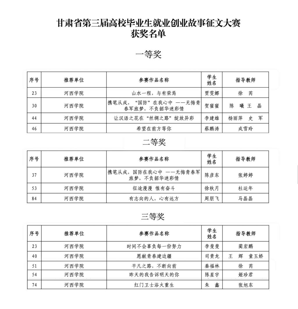 近日,由省教育厅组织举办的甘肃省第二届高校就业创业指导教师职业能力大赛、甘肃省第三届高等院校就业创业课程案例设计大赛和甘肃省第三届高校毕业生就业创业故事征文大赛获奖结果公布,我校师生表现出色,在多项赛事中喜获佳绩。同时,学校获得“优秀组织奖”奖。