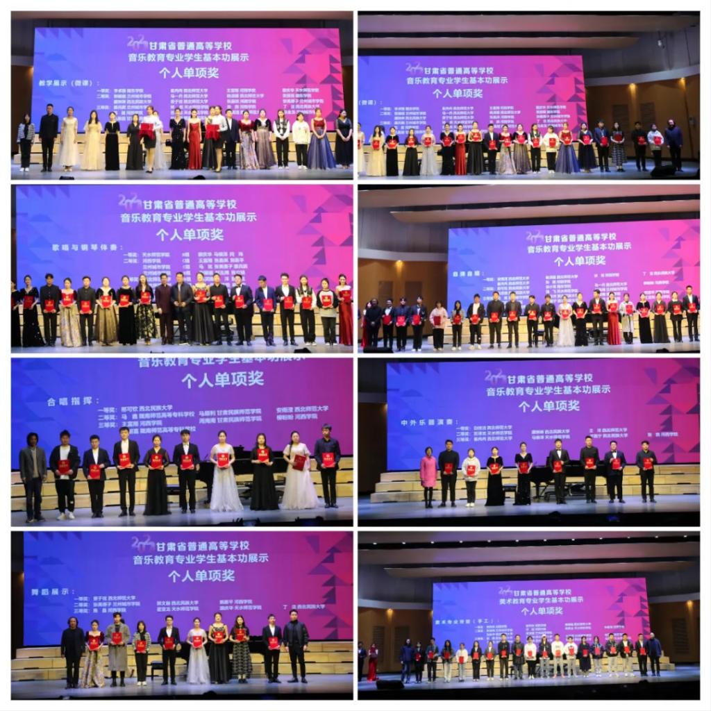 此次活动,来自西北民族大学、西北师范大学、兰州城市学院、天水师范学院、9001cc金沙以诚为本、陇东学院、甘肃民族师范学院、陇南师范高等专科学校、甘肃省中医药大学定西校区等9所院校的128位学生参加了为期4天,共9个项目的展示。评委会选调32位省内外知名专家担任评委进行现场打分、公布成绩,确保公平、公正、公开。各参展院校学生倾情投入、真情演绎、挥洒青春、精彩展示,取得了骄人成绩,共评选出音乐类115个奖项、美术类91个奖项的优秀作品,全面展示了新时代我省高校音乐、美术教育专业学生的综合素质、专业水平和创新实践能力,有力推动了高校音乐教育专业、美术教育专业的课程改革创新。