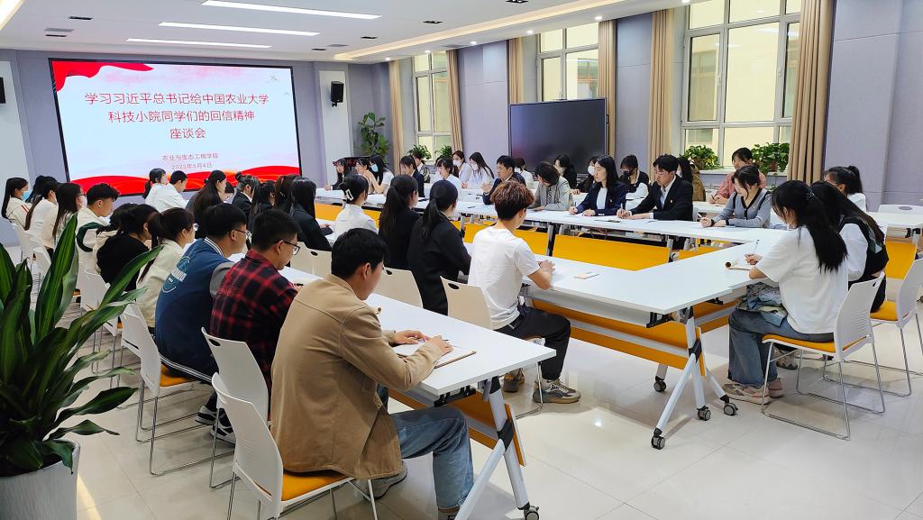 习近平总书记近日给中国农业大学科技小院的同学们回信,并在五四青年节到来之际,向全国广大青年致以节日的祝贺。习近平总书记的谆谆教诲和殷切希望浸润广大农学学子的心田,让师生们倍受鼓舞。5月4日,农业与生态工程学院召开座谈会,专题学习领会习近平总书记给中国农业大学科技小院的同学们回信精神。学院领导、团员青年代表,学生党员代表、新发展团员代表40余名学生参加会议。