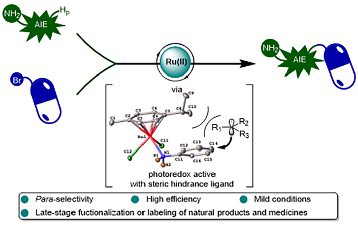 我校王俊科课题组与黑龙江大学李光明/安光辉课题组合作报道了一种可见光钌催化条件下无保护苯胺的对位选择性烷基化反应。特殊的Ru-N配位结构使得反应具有温和的条件、极高的反应效率(2小时)和良好的区域选择性。良好的官能团耐受性允许反应进行天然产物和药物结构的后期功能化。具有聚集诱导发光性质的芳胺也可以参与反应并对天然产物和药物结构进行标记。同时结合对照实验、荧光猝灭分析、循环伏安、X射线光电子能谱以及动力学实验结果,提出了该反应可能的反应机理。