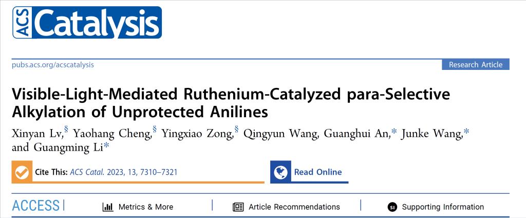 近日,我校甘肃省河西走廊特色资源利用重点实验室王俊科课题组与黑龙江大学李光明/安光辉课题组合作在催化领域期刊《ACS Catalysis》(中科院一区,影响因子13.7),发表了以“Visible-Light-Mediated Ruthenium-Catalyzed para-Selective Alkylation of Unprotected Anilines”(DOI: 10.1021/acscatal.3c00901)为题的研究论文。我校宗盈晓教授和黑龙江大学硕士生吕新焱和程瑶航为该论文共同第一作者,我校王俊科教授和黑龙江大学李光明教授、安光辉教授为该论文的通讯作者。该研究工作得到了国家自然科学基金项目、甘肃省重点研发计划、黑龙江省普通本科高等学校青年创新人才培养计划等项目的资助。