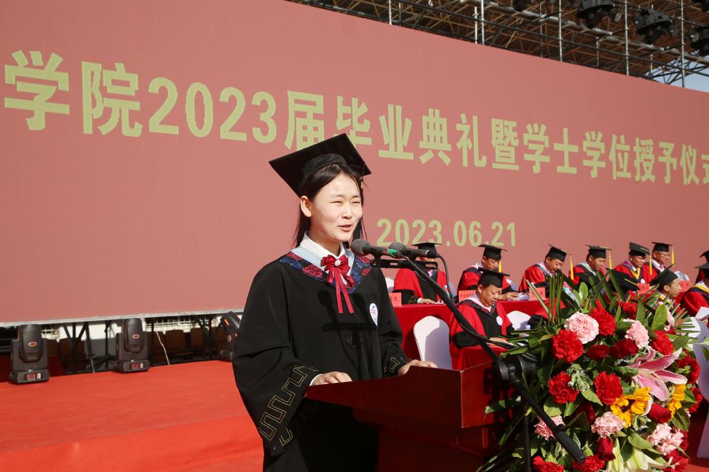 毕业生代表护理学院唐玉潇同学在发言中,代表同学们向母校和付出辛劳的老师表达崇高的敬意,表示将铭记“明德尚美,求真笃行”的校训和“追求卓越、自强不息”的学校精神,运用所学知识与技能,在工作中勤于实践,踏实做事,在追求真理的道路上阔步前行!