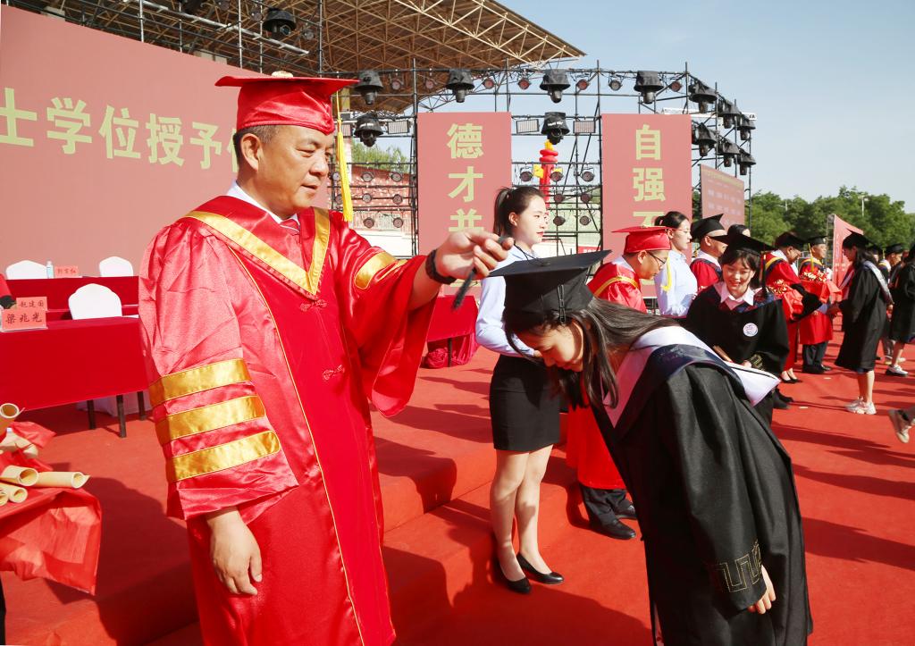 党委副书记、校长周勇为获得学士学位的毕业生正冠拨苏