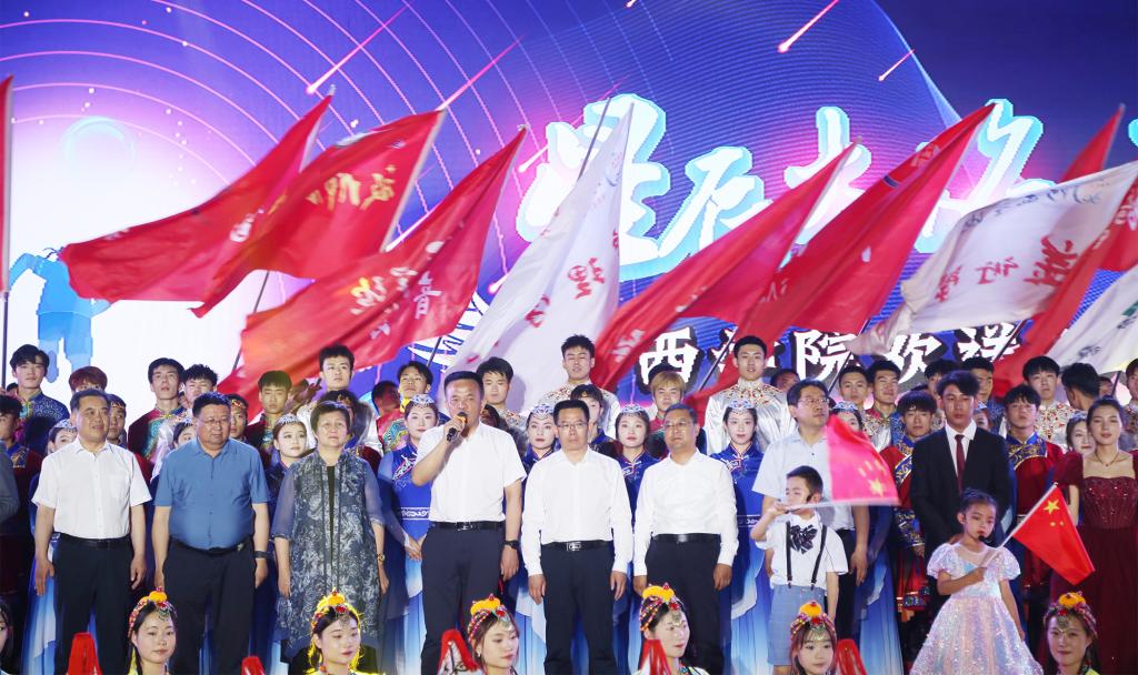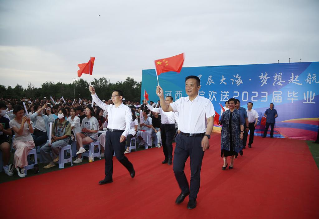 最后,党委书记梁兆光、校长周勇等学校领导走上舞台,表达对毕业生的深切祝福。梁兆光表示,毕业晚会既是全校师生对毕业生美好祝愿的充分表达,也是同学们四年成长锻炼的全面展示。5000多名毕业生即将踏上人生新的征程之际,为同学们送上四点祝福和希望。一是希望同学们立鸿鹄之志。要始终牢记“明德尚美 求真笃行”之校训和“文理兼修 德才并重”之校风,爱党爱国,努力工作;二是希望同学们担强国使命。与祖国同呼吸,与人民共命运,与时代同步伐,勇于担当,主动作为;三是希望同学们撒奋斗的汗水。用奋斗擦亮青春底色,用你们眉毛上辛勤的汗水赢得眉毛下幸福的泪水,困难面前做清醒者、拼搏者和顽强者,在平凡的岗位上做出不平凡的事业;四是希望同学们树河院形象。建校82年以来,学校培养了12万多名优秀毕业生,河西学子以“一靠三实”的良好品质在千里河西走廊竖起了一座教育丰碑。聚是一团火,散是满天星。今天你们因母校而自豪,明天母校一定会因为你们而骄傲!祝福2023届毕业生前程似锦,未来可期!