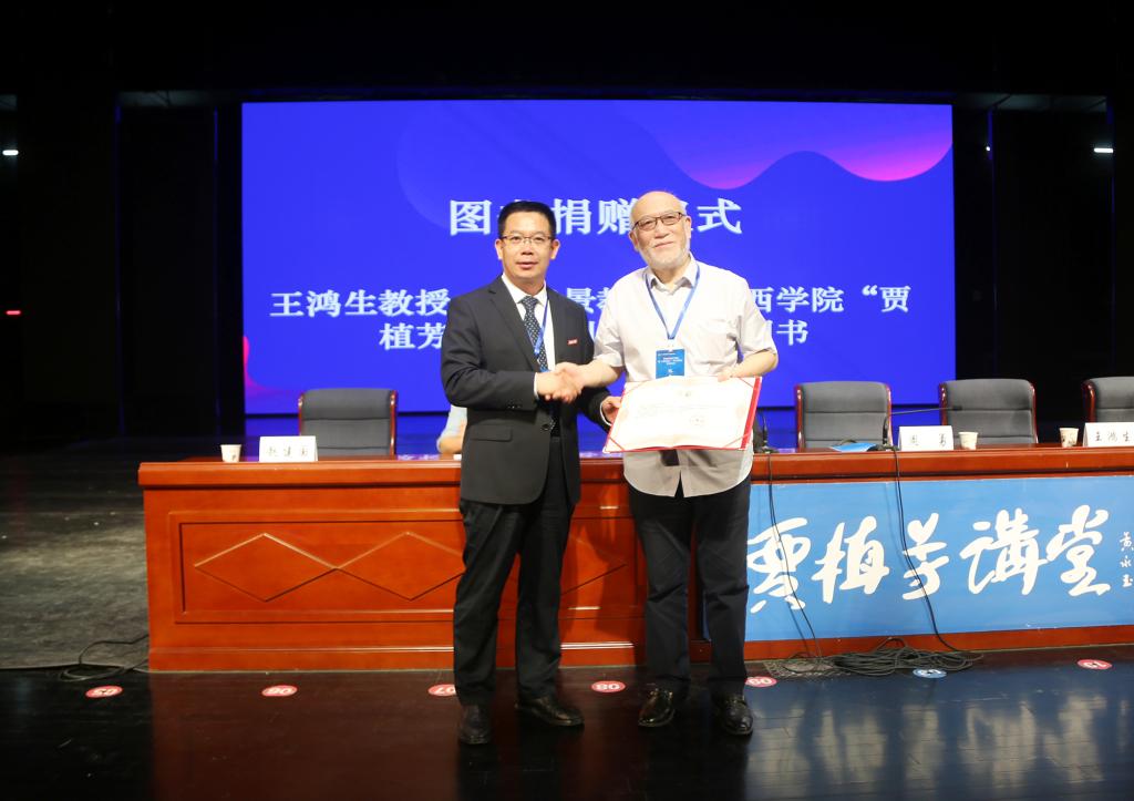 同济大学王鸿生教授和上海大学曲春景教授向“贾植芳藏书陈列馆”捐赠5800余册书籍,9001cc金沙以诚为本图书馆馆长闫廷亮教授接受捐赠,校长周勇向王鸿生教授颁授了图书捐赠证书。