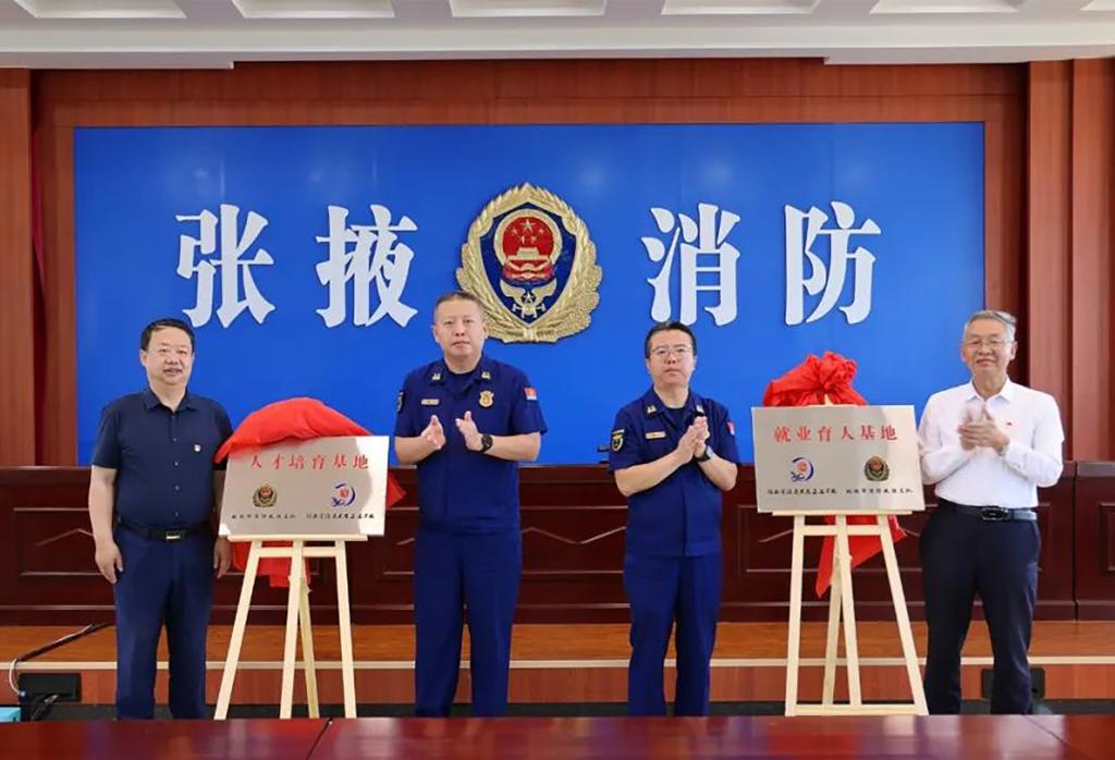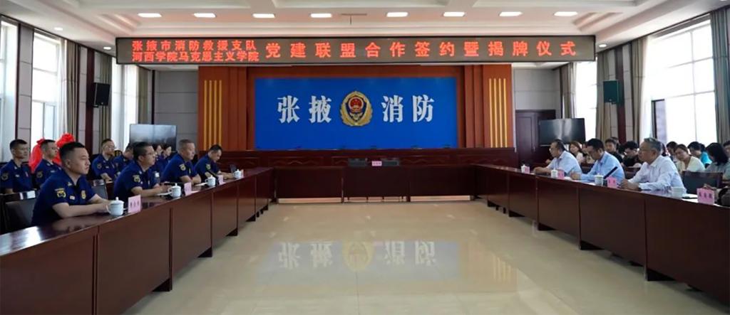 为庆祝中国共产党成立102周年,7月4日上午,马克思主义学院与张掖市消防救援支队 “践初心使命担当 重党建共谱华章”党建联盟合作协议签约暨揭牌仪式在张掖市消防救援支队举行。党委常委、副校长、组织部部长高荣,张掖市消防救援支队党委书记、政治委员张立之,消防救援支队机关及滨河消防站全体指战员,我校马克思主义学院师生党员代表参加了此次活动。仪式由张掖市消防救援支队支队长杨晓勇主持。