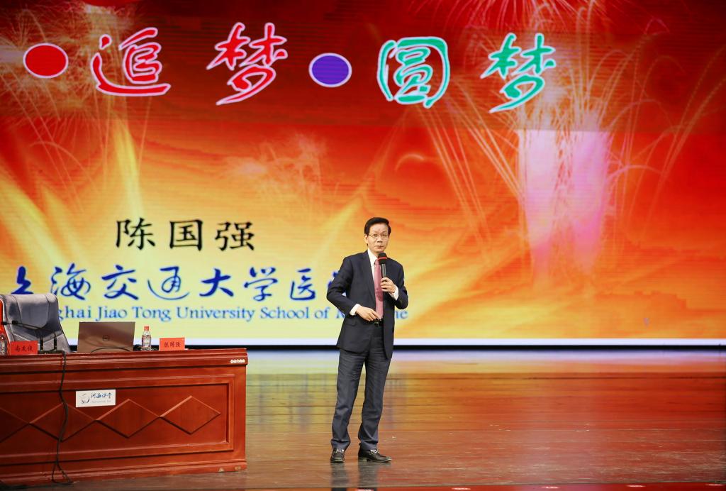 报告上,陈国强院士从教育、科技、人才的内涵出发,引用陶行知先生的“千教万教教人求真,全学万学学做真人”,指出教育的使命不仅要传授知识,也要有恰当的思维。他引导年轻人要保持定力,了解社会和自然,锻炼自己,才能站得高看得远。要少些功利,多一些家国情怀。他结合自身成长经历、多年的工作经验,深入浅出讲解了医学前沿科技及卫生健康科普相关知识,讲述梦想的意义与个人的成长经历,畅谈教育教学的改革与实践,分享对医学使命及其实现路径的真知灼见,并勉励广大医务工作者积极创新医学教育的生态体系,努力培养有灵魂的卓越创新人才;鼓励学生“以梦想催生激情、以激情成就未来”,做一个胸怀理想的追梦人、做一个品行高洁的人,为实现中国梦激扬青春,贡献力量;要爱学生,“让不优秀的学生变优秀、没有梦想的学生有梦想、不能坚持的学生能坚持”,在黑暗中点亮火把,照耀前行,做有脊梁的人。最后他祝愿9001cc金沙以诚为本教学相长,师生同心,坚守初心使命,为河西地区教育事业做出更大贡献。