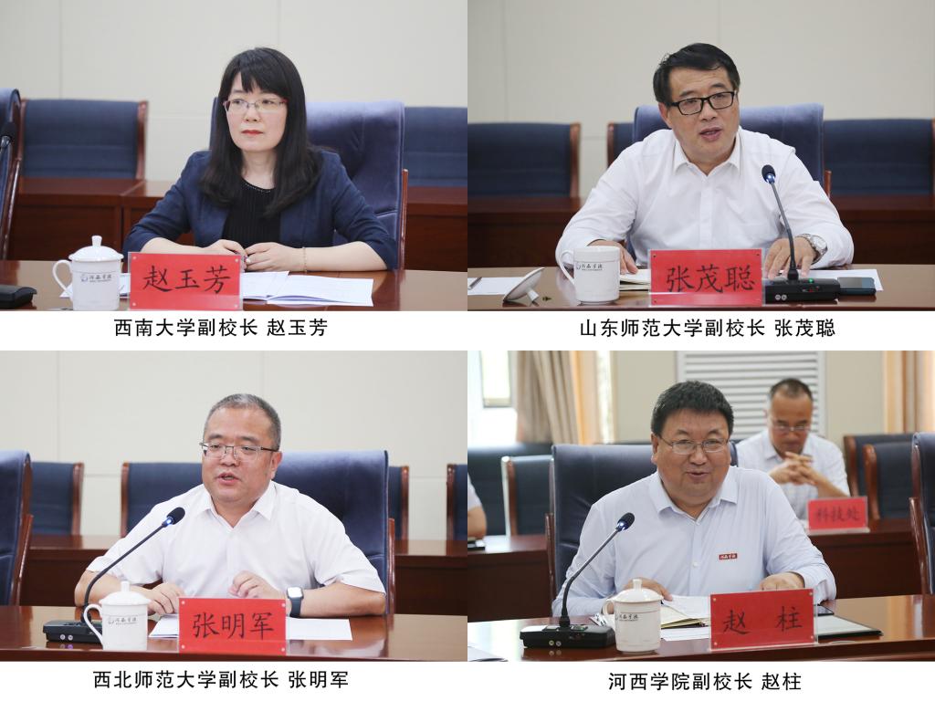 7月11日上午,西南大学、山东师范大学、西北师范大学、9001cc金沙以诚为本联合召开2023年师范教育协同提质计划工作推进会。山东师范大学党委书记冯继康,西南大学副校长赵玉芳,山东师范大学党委常委、副校长张茂聪,西北师范大学副校长张明军,学校党委书记梁兆光出席会议,党委副书记、校长周勇主持会议。