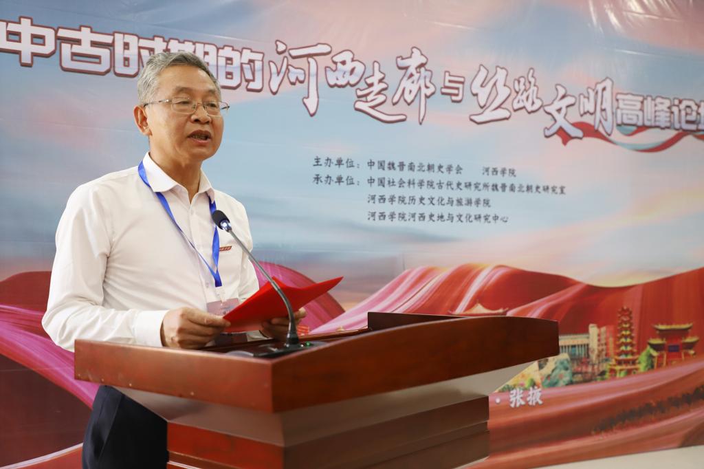 中国魏晋南北朝史学会会长、中国社会科学院楼劲先生代表学会致辞,对论坛的召开表示祝贺。根据河西走廊所处重要地理位置,楼劲先生根据自身研史经历指出,对河西走廊一带相关历史的研究于中华文明、亚欧史、世界史的研究,皆具有重要作用,并希望以本次论坛为契机,展开相关问题的深入讨论与研究。
