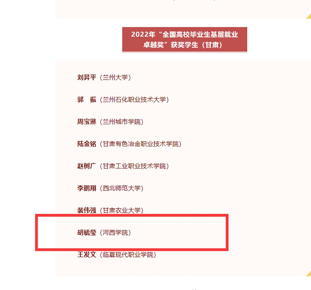 近日,中国教育发展基金会发布2022年“全国高校毕业生基层就业卓越奖”获奖名单,我校学生胡毓莹喜获“全国高校毕业生基层就业卓越奖”荣誉。