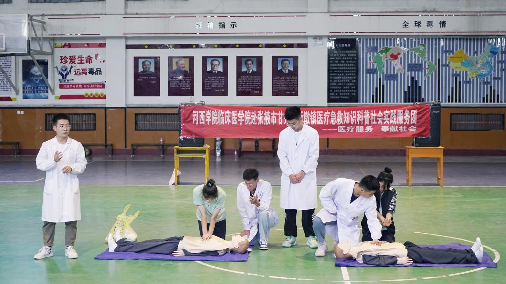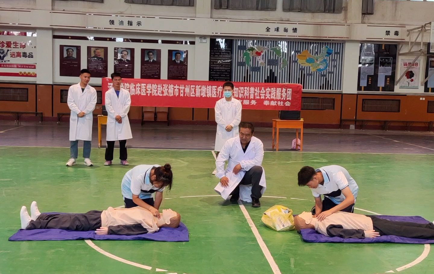 本期军训战地医疗救护知识培训师资主要来源于临床医学院暑期社会实践团,团队成员包括临床医学院与附属张掖人民医院的急救专业教师、临床医师和临床医学专业高年级学生,实践团以“医疗奉献、服务社会”为宗旨,面向学生进行医疗健康知识科普、急救技能实践演练,提高同学们的健康意识及水平,了解、掌握基本医疗急救知识及方法,提高自救互救的能力。