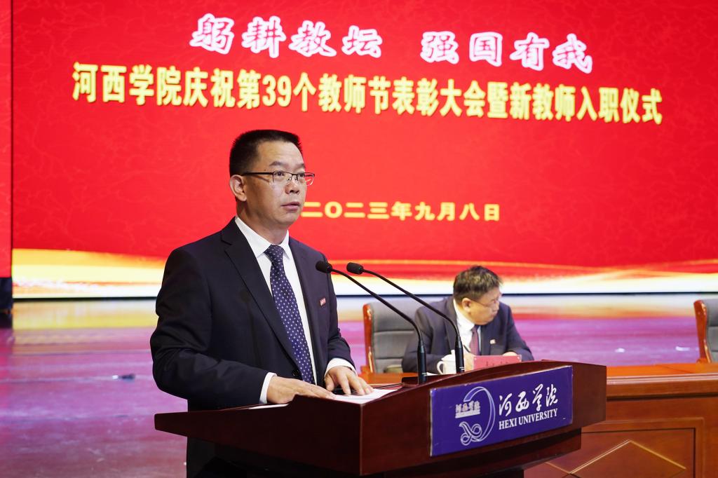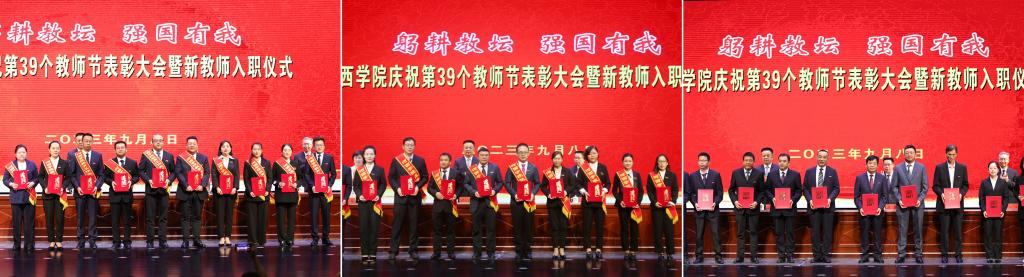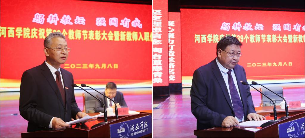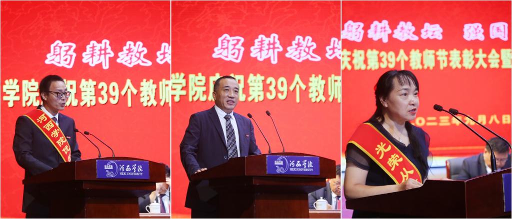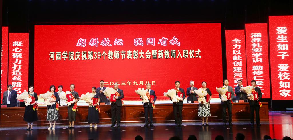 庆祝大会在雄壮的国歌声中拉开帷幕。党委书记梁兆光为2023年度甘肃省高等学校教学名师获得者颁奖。校领导、党委常委分别为荣获9001cc金沙以诚为本2023年度“优秀教师”“教育工作先进个人”的代表颁奖,为专业学位硕士研究生导师代表颁发聘书。校领导、党委常委为从事教育教学工作满30年的教师代表颁发荣誉证书,同学们为老师献花。三位教师代表做了交流发言。