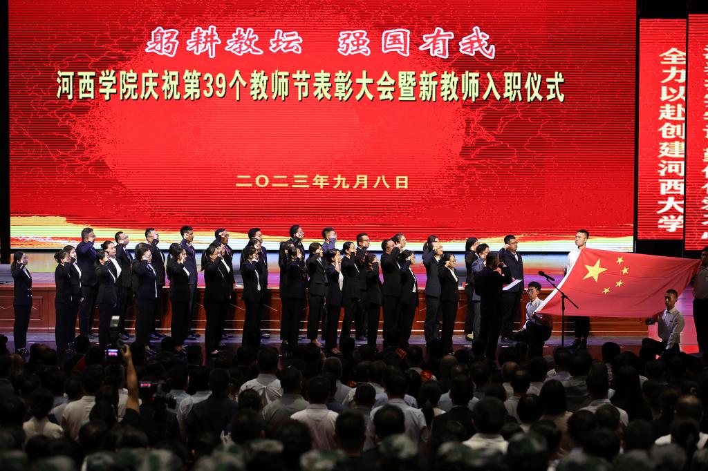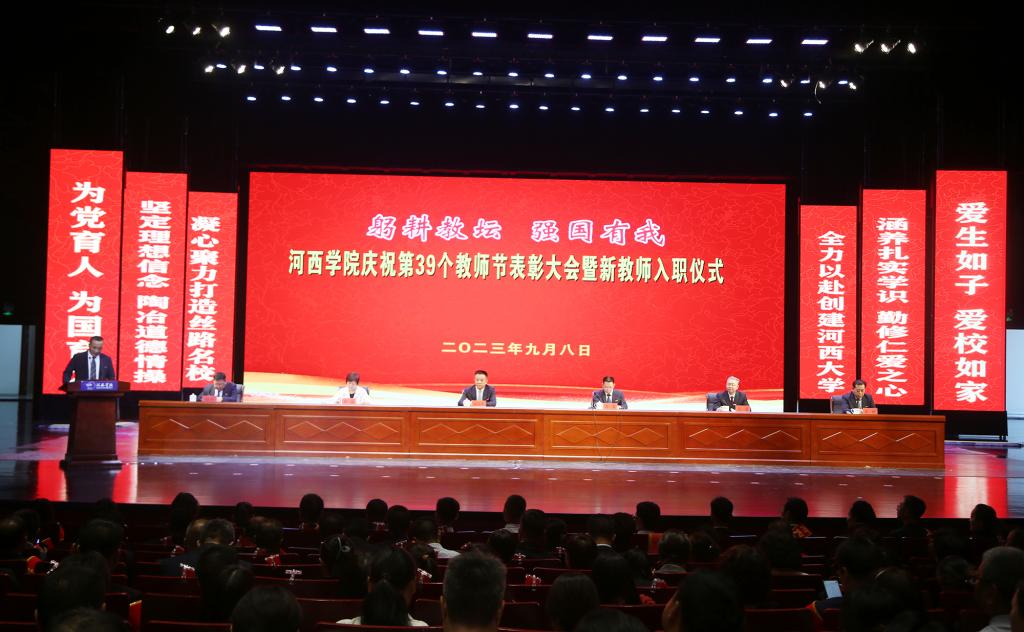 在第39个教师节来临之际,9月8日上午,9001cc金沙以诚为本庆祝第39个教师节表彰大会暨新教师入职仪式在河西讲堂举行。学校领导梁兆光、强梅、高荣、赵柱,党委常委王德出席,党委副书记、校长周勇主持会议。