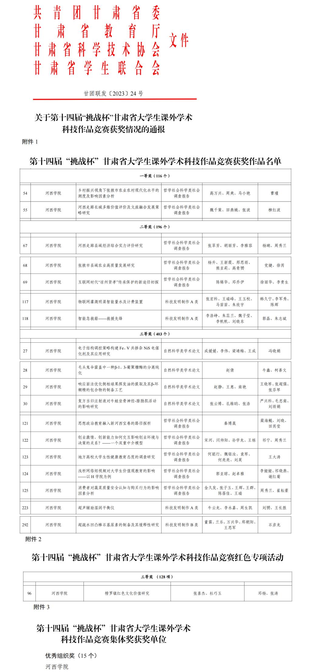 第十四届“挑战杯”甘肃省大学生课外学术科技作品竞赛和红色专项活动由团省委、省教育厅、省科协、省学联联合主办。自开赛以来,校团委高度重视,积极准备,结合校内科技立项项目评审,邀请专家对上报项目严格把关、精心指导,最终我校经济管理学院学生高万兴、周爽、马小艳参与,曹瑾老师指导的《乡村振兴视角下张掖市农业农村现代化水平的测度及影响因素分析》以及历史文化与旅游学院学生魏千策、田燕娥、张波参与,柳红波老师指导的《河西走廊长城多维价值评价及文旅融合发展策略研究》获得第十四届“挑战杯”甘肃省大学生课外学术科技作品一等奖;经济管理学院学生张翠芳、胡丽芳、李雅容参与,杨瑚、周秀兰老师指导的《河西走廊县域经济综合实力评价研究》等5项哲学社会科学类社会调查报告,荣获第十四届“挑战杯”甘肃省大学生课外学术科技作品二等奖;化学化工学院学生成媛媛、李伟、梁靖梅、王成参与,冯晓娟老师指导的《电子结构调控策略构建 Fe、V 共掺杂 NiS 电催化剂及其应用研究》等11项自然科学类学术论文,荣获第十四届“挑战杯”甘肃省大学生课外学术科技作品三等奖。