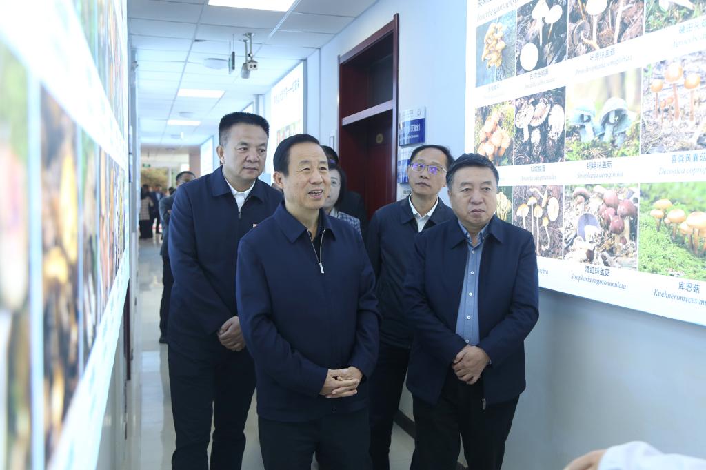 调研中,梁兆光向许达哲一行介绍了学校办学历史、学科建设、科学研究、人才援疆、服务地方经济社会发展等方面的情况。许达哲一行参观了应用真菌工程实验室,详细了解了实验室基本情况、祁连山菌物保护利用研究、服务地方食用菌产业发展以及菌物科普等工作。