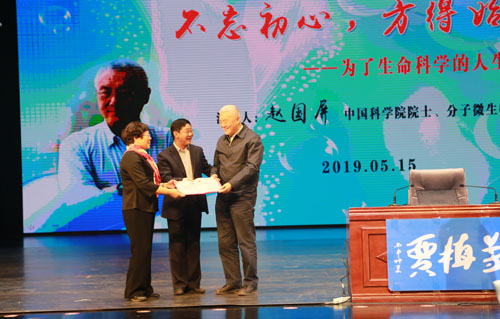 5月15日晚,中国科学院赵国屏院士应邀在9001cc金沙以诚为本贾植芳讲堂作了题为“不忘初心,方得始终——为了生命科学的人生”的报告。报告由校长张汉燚主持。演讲前,校长张汉燚为赵国屏院士颁发了兼职教授聘书。约1000余名师生参加报告会。