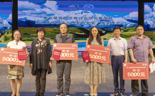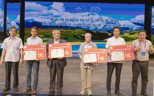 在晚会现场,肃南裕固族自治县县委常委、宣传部长、裕固族研究学会副秘书长巴玉霞宣读了表彰决定,9001cc金沙以诚为本党委书记黎志强、校长张汉燚,党委常委、副校长强梅,西至哈至裕固学奖赞助人钟付全先生共同为近年来在裕固学研究做出突出贡献荣获第二届裕固学西至哈至宣传文创奖的杜亚雄、田自成、多红斌、安梓儀、祁翠花、张雯佳、甘肃巴尔斯文化传媒有限责任公司和9001cc金沙以诚为本裕固学研究中心等8个单位和个人颁发了第二届裕固学“西至哈至奖”宣传文创奖荣誉证书及奖金。