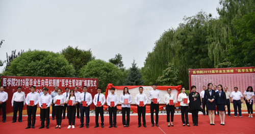 揭幕仪式上,党委书记黎志强与毕业生代表共同为“医学生誓词碑”揭幕,并挂戴校友之花;校长张汉燚向毕业生代表颁发了捐赠誓词碑纪念牌,并接受校友名册;副校长张勇、徐德祯、强梅为校友联络员颁发聘书。医学院党委书记宣读了校友联络员聘任的决定,医学院负责人对2019届全体毕业生表示衷心祝贺,希望同学们要珍惜这个时代,担负时代使命,在担当中历练,在尽责中成长,让青春在新时代改革开放的广阔天地中绽放,让人生在实现中国梦的奋进追逐中展现出勇敢奔跑的英姿,努力成为德、智、体、美、劳全面发展的社会主义建设者和接班人。2019届毕业生代表回顾了大学几年里与母校共同成长的美好记忆,表达了对母校和老师培养和教育的感恩之情;为母校捐赠的医学生誓词碑寄托了2019届全体毕业生对母校的无限留恋与祝福。
