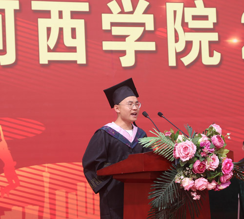 马克思主义学院思想政治教育2015级2班杨想俊同学代表全体毕业生发言,“请母校放心,请老师放心,我们一定肩负起‘河西学子’的这份责任与荣光,在奋斗中释放青春激情,逐梦青春理想,以青春之我,奋斗之我,为民族复兴铺路架桥,为祖国建设添砖加瓦,创造属于我们的辉煌”。