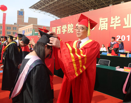 党委书记黎志强教授为获得学士学位的毕业生一一正冠拨苏