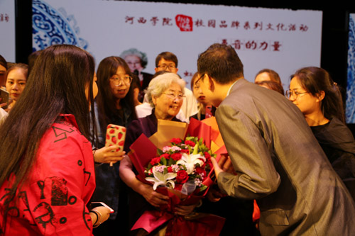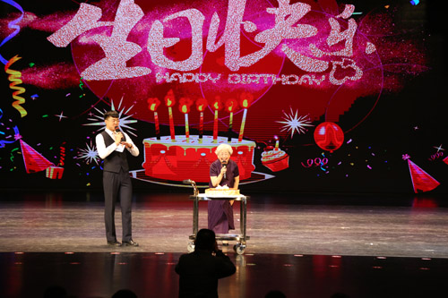 活动中,虹云老师通过台上台下互动的方式,带领全场观众一起、朗诵了经典篇目《读中国》,观众们互动热烈;现场师生向虹云老师进行了提问,她结合自己多年从事播音主持的经历,风趣幽默的与学生进行了互动交流;虹云老师在现场朗诵《长江之歌》,观众掌声不断,享受着美好的声音带给我们的力量。活动中,河西学子也为虹云老师献上歌曲《我的深情为你守候》,表达了河西学子对虹云老师的尊敬,并一同为虹云老师庆祝七十五岁生日。