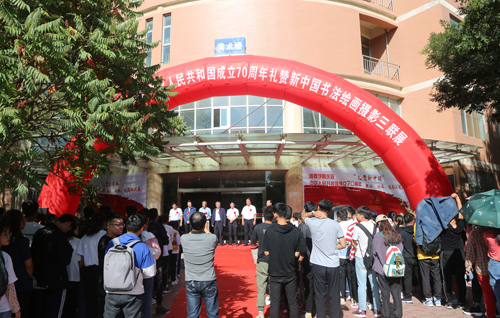9月29日下午,由校工会、校友会、美术学院、文学院、信息技术与传媒学院主办的“礼赞新中国”——庆祝中华人民共和国成立70周年书法、绘画、摄影展在学校美术馆开幕。学校领导赵凯、张汉燚、周均发、强梅、顾长兆、马聪,党委常委赵柱、王德出席开幕仪式并剪彩,学校各部门、二级学院负责人,学生代表,书法、绘画、摄影作品作者400余人参加了开幕仪式。开幕仪式由党委常委、副校长强梅主持,党委常委、副校长周均发在开幕仪式上致辞。