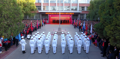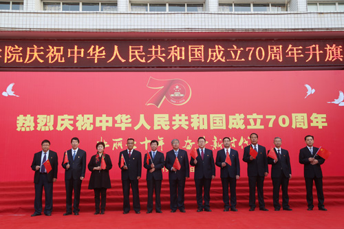 节日的校园,彩旗飘飘,花团锦簇,处处洋溢着浓浓的爱国情和欢乐喜庆的节日气氛。10月1日上午8点,9001cc金沙以诚为本同升国旗、同唱国歌主题教育举行。学校领导赵凯、张汉燚、王兵、周均发、徐德祯、强梅、顾长兆、马聪,党委常委高荣、赵柱、王德和全校教职工及学生代表参加。党委副书记王兵主持仪式。党委书记赵凯讲话。