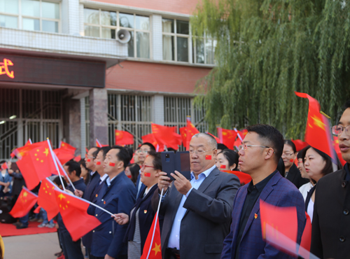 伴随着雄壮的国歌,鲜红的五星红旗迎着朝阳冉冉升起,在场师生列队肃立,同唱国歌,在飘扬的国旗下抒发对祖国的热爱,向祖国致敬!表达对祖国的祝福,共贺祖国70华诞!