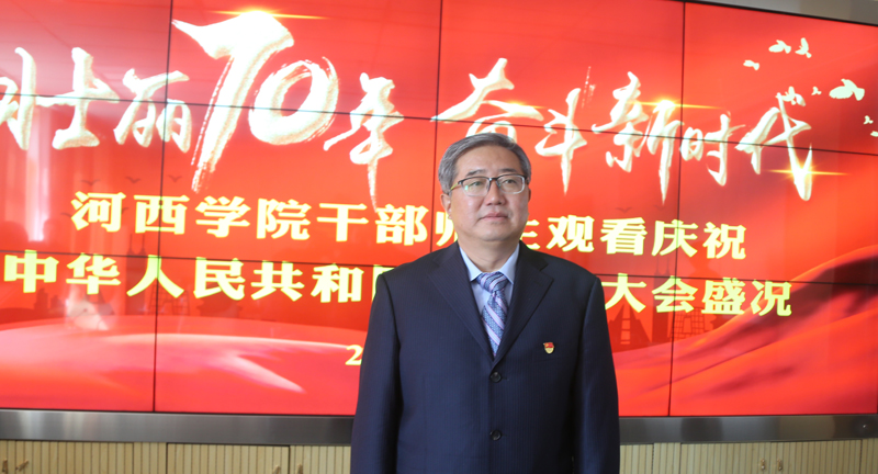 党委常委、教务处处长赵柱谈到,今天是共和国七十华诞,学校举行了隆重的升旗仪式,集体收看隆重的国庆纪念大会、盛大阅兵式和群众游行盛况,深切感受到祖国七十年沧桑巨变和砥砺奋进的辉煌成就。为我们伟大祖国骄傲,衷心祝福我们伟大的祖国,明天更美好!作为一名有30年教龄的高校教师,与祖国共成长,在教书育人的平凡岗位上,不忘初心、牢记使命,潜心培养学生,努力传承优秀文化,师生携手共进,为超越梦想共同努力奋斗!真诚道一声:“祖国您好!”“我爱您,中国!”