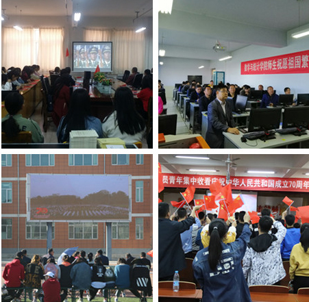 党委书记赵凯指出,中华人民共和国成立70周年,是不忘初心、牢记使命、不懈奋斗的70年。国庆阅兵式让我们感受到了国富民强,大国崛起。70年来,在中国共产党的坚强领导下,中国人民创造了举世瞩目的中国奇迹,谱写了砥砺奋进的壮丽篇章,走出了一条波澜壮阔的人间正道,书写了一个靠奋斗赢得幸福的当代传奇。中华民族从未像今天这样赢得世界的尊敬,中国人民从未像今天这样意气风发!新时代是奋斗者的时代,作为高校教育工作者,就是要坚持立德树人为己任,时刻不忘教育报国初心、始终牢记为党育人、为国育才使命,把习近平总书记的重要讲话和指示精神转化为推动学校发展的具体举措,不断提升办学水平和服务地方能力,为培养德智体美劳全面发展的社会主义建设者和接班人,办好人民满意的教育而努力奋斗。