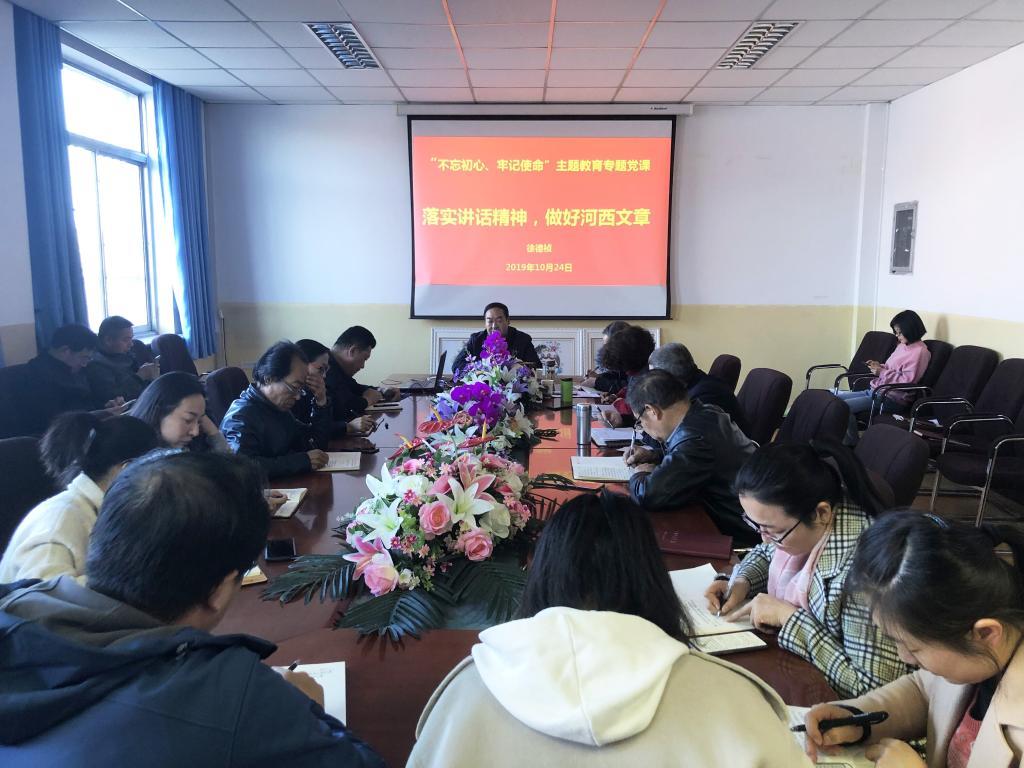 会上,徐德祯副校长围绕习近平总书记8月19日至22日视察甘肃重要讲话和指示精神,结合我校的战略区位、办学历史、办学定位、学科专业、教育教学、师资力量和科研成果,就新形势下,如何做好“深挖资源禀赋,弘扬传统文化”、“讲好西路军故事,传承红色基因”、“加快教育改革、培养应用型人才”、“强化环保意识、助力生态研究”、“对接主导产业、服务脱贫攻坚”作了专题讲授。并强调指出:西路军故事,就是河西故事。广大党员要切实以“不忘初心、牢记使命”主题教育为契机,守初心、担使命、找差距、抓落实,充分发挥地域优势和资源优势,深入学习、吃透悟透主题教育和习近平总书记系列讲话内涵实质和精髓要义,武装头脑、整合力量,全力以赴做好人才培养、文化传承与保护、产业扶贫和创新工作。