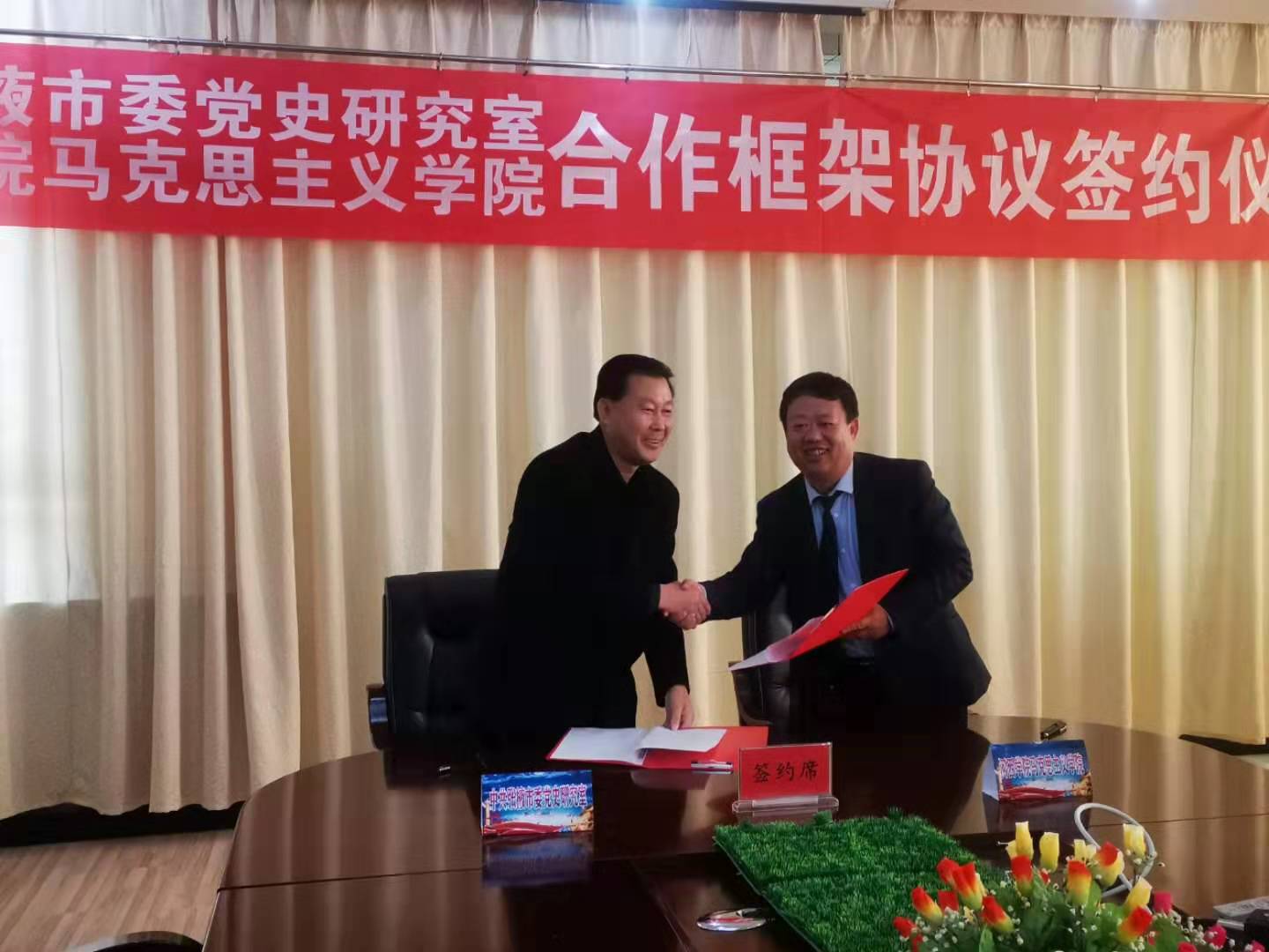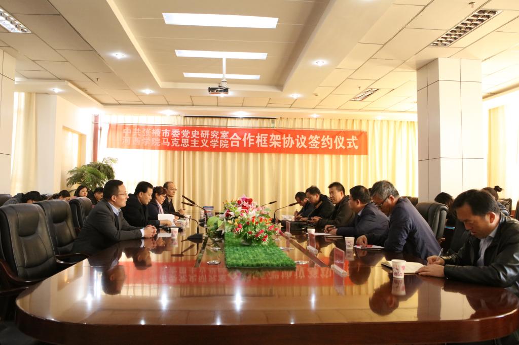 为深入贯彻落实习近平总书记视察甘肃重要讲话和指示精神,不断提升党史研究服务全市发展大局能力水平,11月1日上午,张掖市委党史研究室与马克思主义学院正式签订合作框架协议,双方就党史党建理论研究、红色文化传承、服务地方社会等方面合作内容达成一致,开启了张掖党史研究与地方高校合作新模式。签约仪式由9001cc金沙以诚为本发展规划处负责人主持,张掖市委党史研究室负责人、科技处、教务处等部门和马克思主义学院领导班子及教师参加了签约仪式。