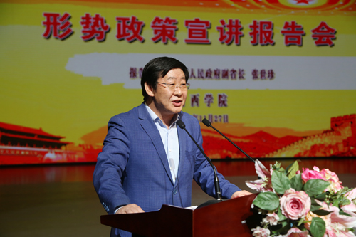 校长张汉燚主持报告会。甘肃省政府副秘书长贾宁、张掖市副市长王向机,学校领导、科级以上干部、思想政治理论课教师、辅导员、班主任和学生代表共计900余人聆听报告。(宣传部)