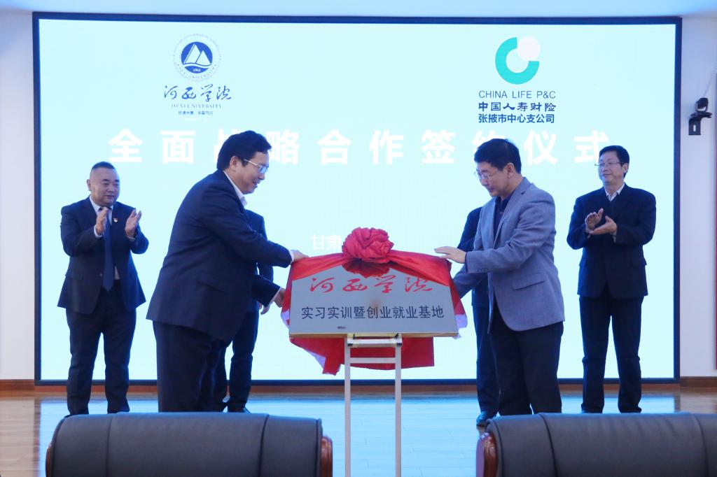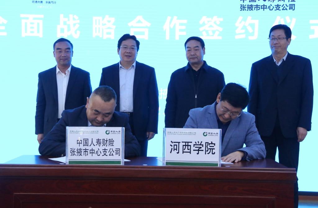 张汉燚与中国人寿财险张掖市中心支公司总经理王永国签订战略合作协议,农业与生态工程学院党委书记刘玉环与中国人寿财险张掖市中心支公司总经理助理宋克九签订农险专家合作协议。