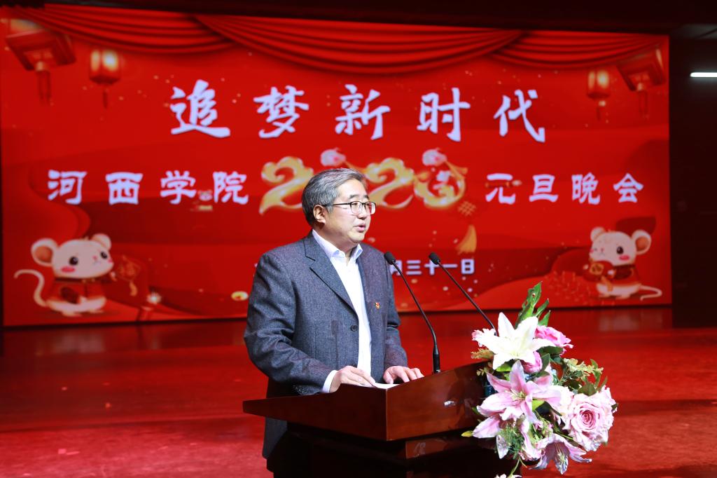 晚会开始前,党委书记赵凯代表学校向全校师生发表新年寄语。寄语回顾了学校一年取得的成绩,指出2020年学校将坚守初心,牢记使命,认真贯彻十九届四中全会精神和习近平总书记视察甘肃重要讲话精神,不断推进学校治理体系和治理能力现代化;坚定“做河西文章,出特色成果,建丝路名校”的发展方向;坚持内涵发展,努力提高教育教学质量;坚持特色发展,进一步凸显办学特色和地域特色;坚持人才强校,打造人才高地;坚持开放发展,积极融入“一带一路”建设;为提升办学水平、实现申硕建大目标而努力奋斗。