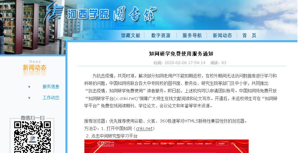 图书馆根据学校春季延迟开学实际,及时通过“钉钉”平台发布分享了维普资讯、超星学术、人大复印报刊资料、万方数据、国研网、寻知数据库、新东方多媒体学习库、库克音乐、Springer Nature、Wiley Online Library等数字资源限时免费服务信息,为广大师生提供学习便利,进一步满足师生假期学习需求。