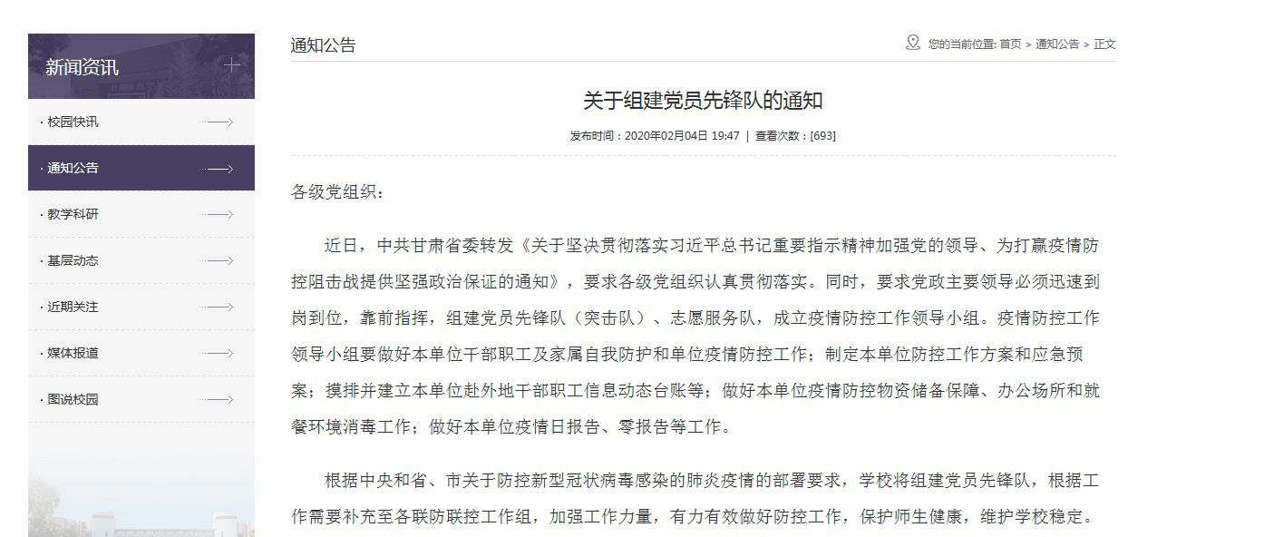 “一名党员就是一面旗帜,一个党组织就是一座堡垒”。面对严峻的防控形势,校党委通过“陇政钉”、微信等信息平台向全校党组织和党员发出“疫情当前 同舟共济”,在平凡的岗位上“守初心 担使命”,积极参与疫情防控工作和组建党员先锋队的倡议。