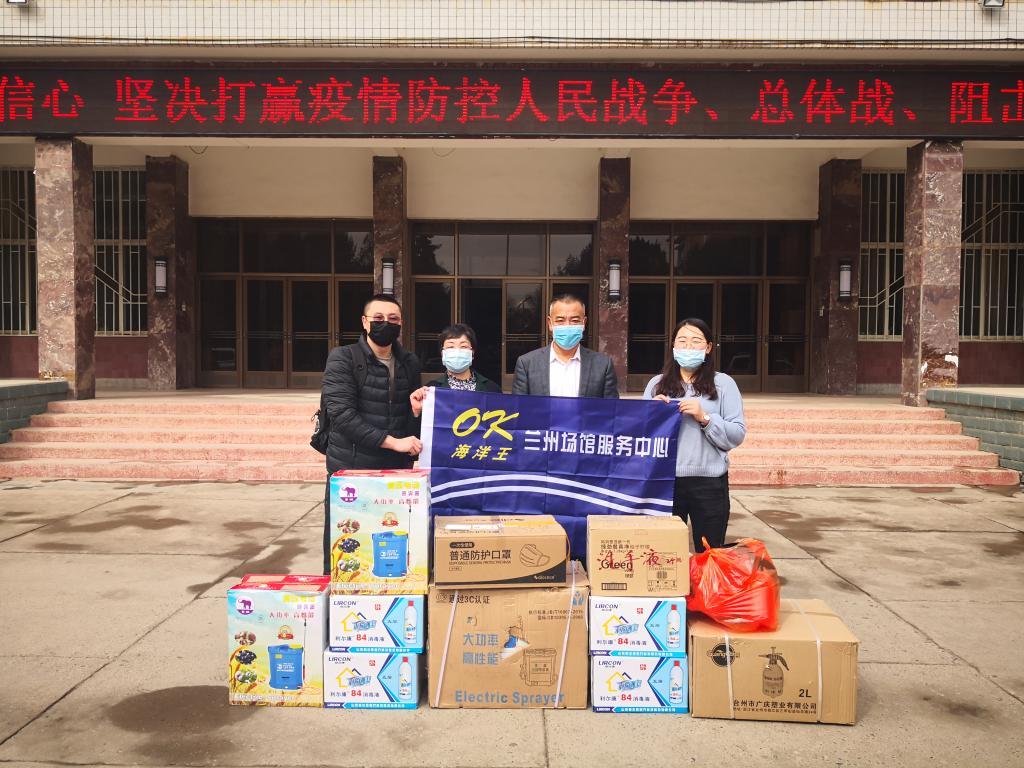 3月20日下午,深圳市海洋王照明科技股份有限公司兰州场馆服务中心服务部经理令云云女士通过9001cc金沙以诚为本2015届体育学院毕业生王世杰向学校捐赠一批防疫物资。其中包括一次性防护口罩1000个、电动高压喷雾器5个、84消毒液120瓶、喷壶25个、洗手液12套。党委常委、副校长周均发代表学校接受捐赠,并向捐赠单位表示感谢。