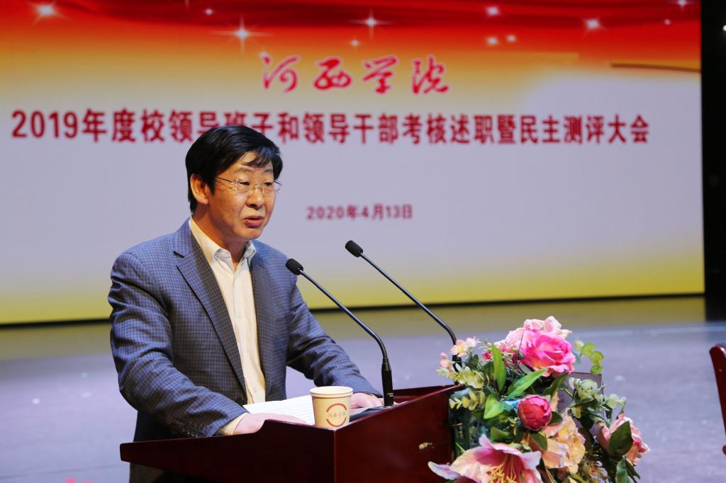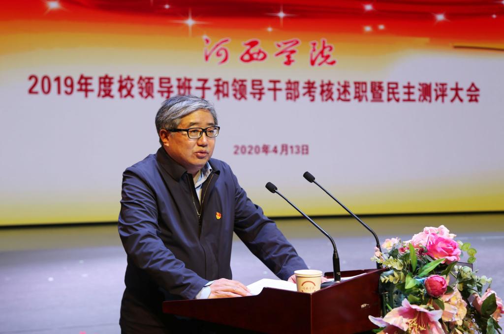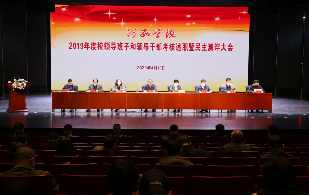 4月13日下午,学校在河西讲堂召开2019年度领导班子和领导干部述职考核暨民主测评大会。省委第三考核组雍萧一行6人出席会议。校领导、中层干部、教授代表150多人参加大会。会议由学校党委书记赵凯主持。