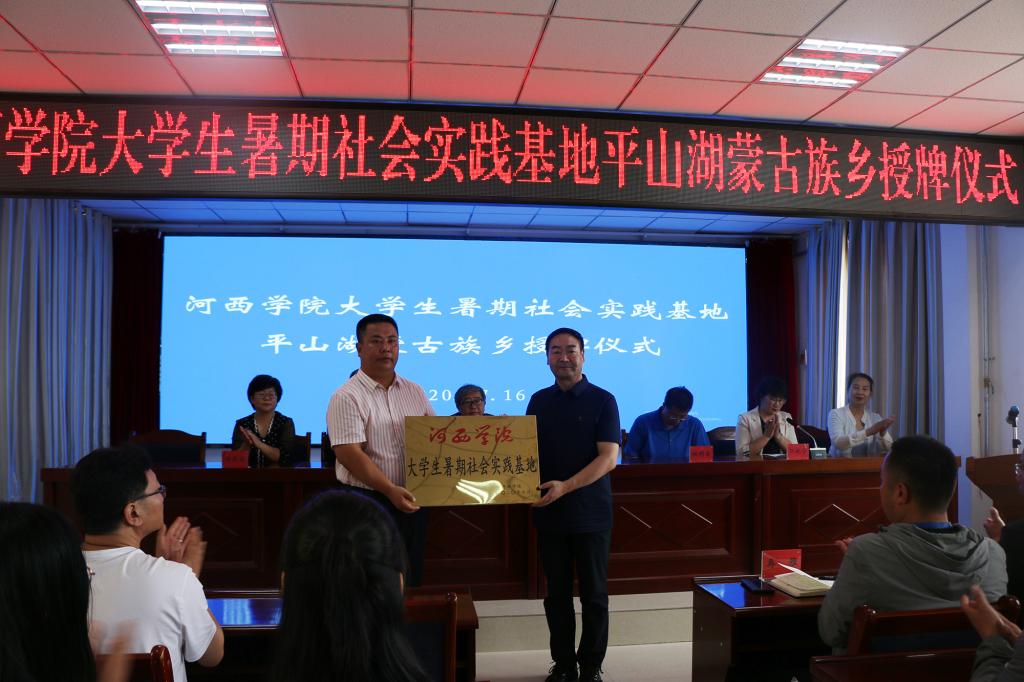 与会领导、实践团队师生以及平山湖蒙古族乡全体干部在平山湖蒙古族乡会议室举行“9001cc金沙以诚为本大学生暑期社会实践基地”授牌仪式。副校长徐德祯代表学校为平山湖蒙古族乡授牌;实践队员代表、美术学2019级3班郭子怡同学作了发言。