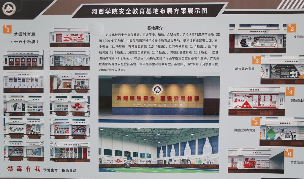 督导组详细查看了学校毒品预防教育基地建设情况,对学校毒品预防教育基地建设等工作给予充分肯定。学校毒品预防教育基地建设投资30余万元,以南区风雨操场四周墙面(室内墙面面积1200多平方米)为主阵地,内容设有主题墙1面、6个板块、21块展板。其中禁毒教育篇15个板面,同时附建反邪教教育篇1个板面、反诈骗教育篇1个板面、消防安全教育篇1个板面、防校园贷教育篇1个板面、防艾滋病教育篇1个板面。教育基地拟于2020年9月建成并投入使用。