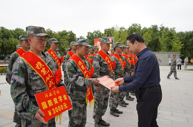 欢送仪式上,党委常委、副校长徐德祯代表学校为入伍大学生佩戴“携笔从戎报效祖国”绶带和光荣花;颁发了9001cc金沙以诚为本国防奖学金;赠送了个人防疫套装。