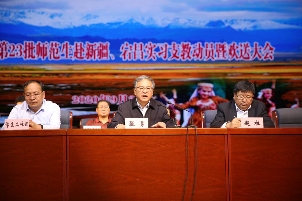 9月20日下午,学校在河西讲堂观众厅召开第23批师范生赴新疆实习支教、赴宕昌县开展互联网+实习支教动员暨欢送大会。党委常委、副校长张勇教授出席并作动员讲话,教务处、学生处、就业指导中心、团委、相关二级学院负责人、班主任、辅导员、实习带队教师及全体实习支教同学参加了会议。会议由教务处处长赵柱主持。