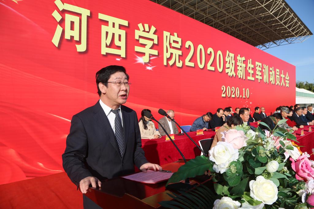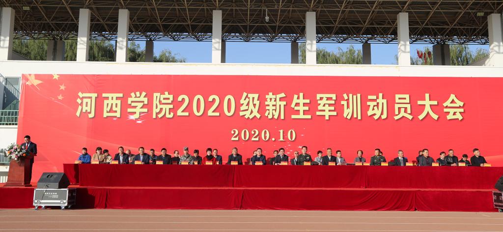 10月12日上午,学校2020级新生军训动员大会在校本部塑胶操场举行。国防大学运新宇少将,学校领导张汉燚、王兵、周均发、张勇、强梅;张掖军分区惠炜上校,党委常委高荣、赵柱、王德,甘州区人民武装部宋佳东中校,相关职能部门负责人,二级学院党政负责人、辅导员、班主任,承训教官及5000多名同学参加动员大会。大会由党委常委、副校长徐德祯主持。